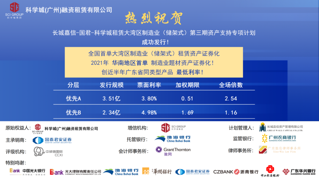 本次资产支持专项计划是全国首单大湾区制造业(储架式)租赁资产证券化产品、2021年华南地区首单制造业题材资产证券化产品,底层资产均以实体制造业资产为重点,涵盖新一代信息技术、智能制造、节能环保、新材料等多个高精尖行业的优质标的物。同时,该产品创下近半年广东省同类型产品优先档最低利率,充分体现了资本市场对“伟德国际唯一官网入口”品牌的高度认可。